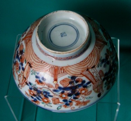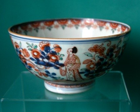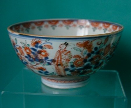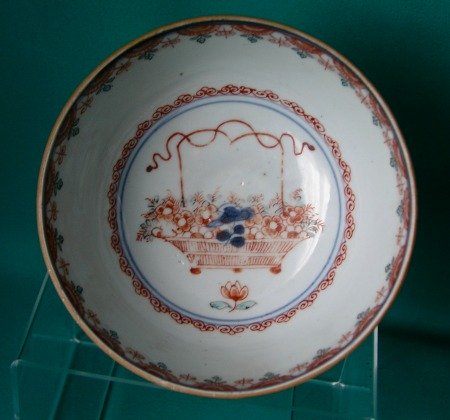 A Chinese export porcelain slop bowl, originally imported into Europe with underglaze blue design, overpainted in Holland in iron red, green and gilding, c.1750. The exterior decorated with flowers and figures, the interior with a basket of flowers. Painted marks in blue on the base. Fine condition.