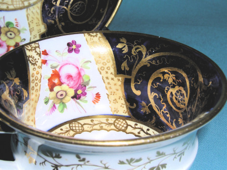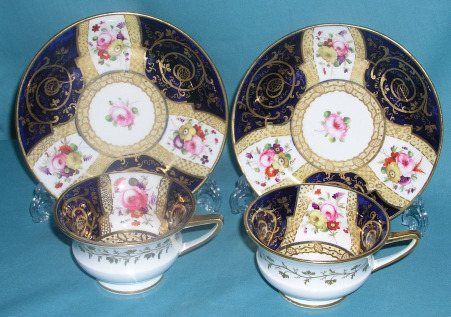 A matching pair of Coalport Cups & Saucers c.1818, Etruscan shape and "hairpin" handle, decorated with panels of flowers in a cobalt blue ground, elaborate gilding. Marks: Pattern 898 in gilt, one cup with 992 in red. Condition: One cup with a hairline.