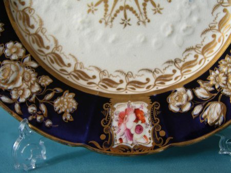 A Coalport dessert plate pattern 988 c.1820-25 of "New Embossed" design with a dark cobalt blue ground colour, the embossed work revealed in in white and highlighted in gilt, the flowers within the panels are painted in natural colours. Dimensions: 23 cm diam. Marks: impressed "2". Excellent condition.