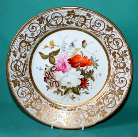 A pair of Coalport porcelain dessert plates c.1820-25, each painted with a superb central study of flowers (probably painted by Thomas Brentnall) the border with ellaborate gilding. Dimensions: 22 cm diam. Condition: minor ware on the gilding. Unmarked.