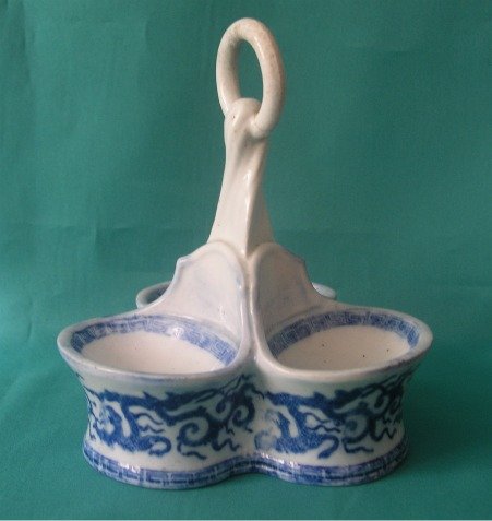 A Rare John Rose Triple Stand c.1803-8, hybrid hard-paste porcelain, with ring handle, decorated with blue printed dragon pattern*. 15cm high. Unmarked. Condition: A hairline on the handle.