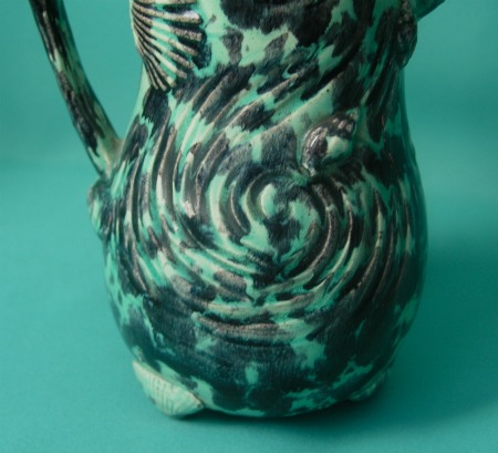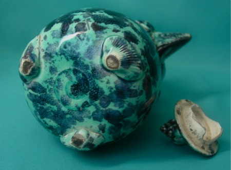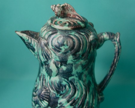 A Very Rare 18th Century Creamware pottery Coffee Pot and Cover (Possibly Continental), with moulded seashell decoration, standing on three shell-shaped legs, painted in Whieldon style in shades of brown and green. Dimensions: 22 cm high. Condition: a chip on the spout and inside the cover. Unmarked.