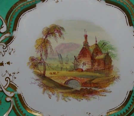A Davenport Porcelain Dessert Plates c.1850, with pierced border and flower moulding, picked out in gilt, painted with a landscape on apple green ground. Dimensions: 22.5 cm diam. Marks: Pattern 2280 painted in red. Condition: Minor ware.