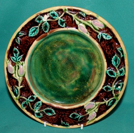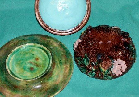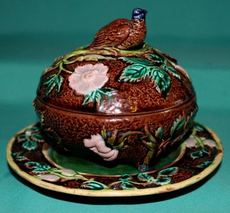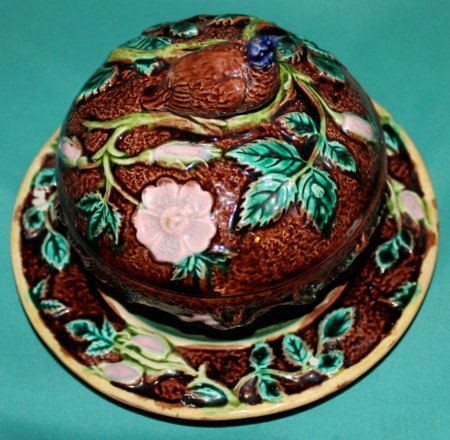 A late 19th Century English Majolica Butter Dish, Cover and Stand, moulded in relief with a bird, perched on a branch, blossom and leafs, painted in coloured glazes. Dimensions: dish:12 cm high x 12 cm diam; stand: 17 cm diam. Condition: minor glaze loss on one of the feet. Unmarked.