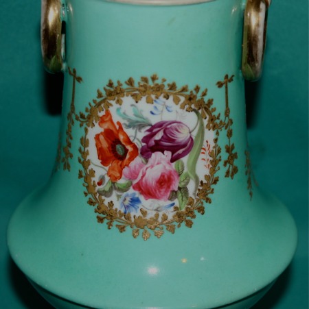 English Porcelain Vase c.1830-40 (Possibly Minton), with two ring handles, finely decorated in Sevres-style with oval cartouches, painted with a couple in country landscape and flower sprays on reverse, surrounded by fine raised gilding on turquoise ground. Dimensions: 23.2 cm high. Condition: minor ware on the gilding. Unmarked.