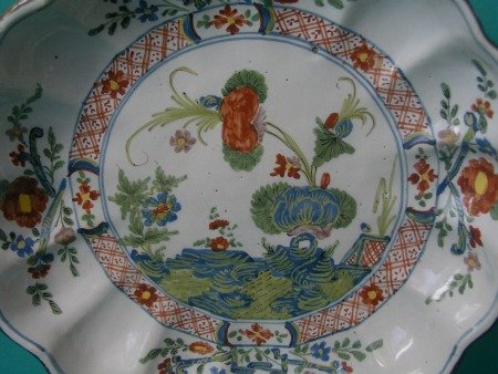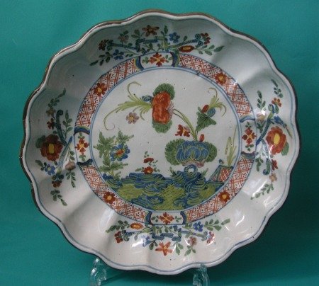 An Italian Faenza Faience dish, (from the Ferniani workshop) with scalloped edge, decorated in the Chinese style in blue, rouge de fer, yellow and green, the centre with tiger flowers, the border with four floral sprays with bamboo above a diaper band. Dimensions: 27.5 cm diam x 5 cm deep. Excellent condition. Unmarked.