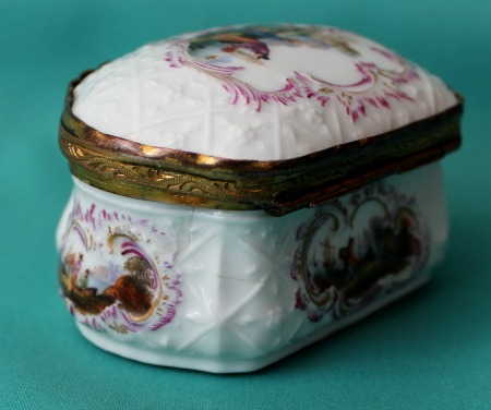 A Rare Frankenthal Porcelain Snuff Box c.1760-70, gild metal mounted, relief-moulded flower decoration, each side with a reserved scrollwork cartuche, finely painted with horbur scenes in polichrome enamels, inside the cover with a scene, depicting cherubs playing with a lion, the box interior gilt. Dimensions: 8.5 cm x 6 cm x 5.5 cm. Condition: two hairline cracks. Unmarked.