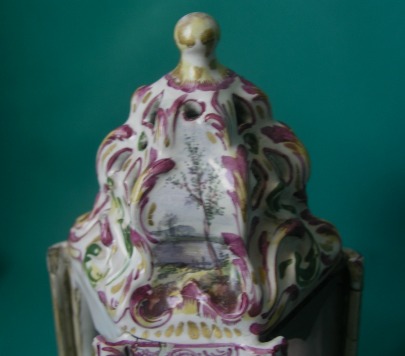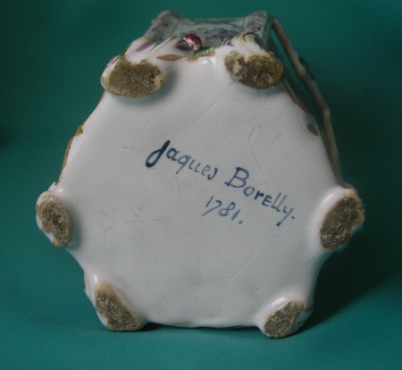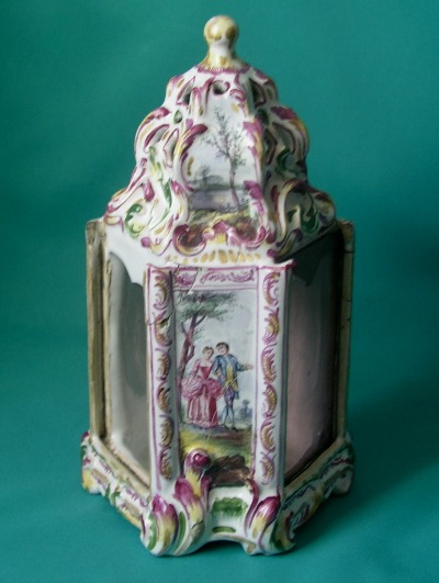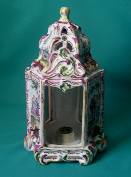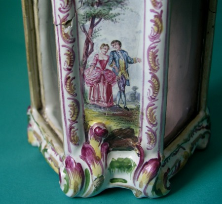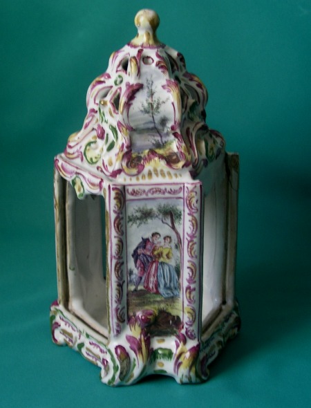 A fine French Faience Hexagonal Candle Lantern, the alternating panels with courting couples and decorated in relief with scrolling leaves, painted with polychrome enamels and gilt, one of the original glass panels still intact. Dimensions: 24cm. Condition: Marks : Signed on the base "Jaques Borelly 1781" in blue.