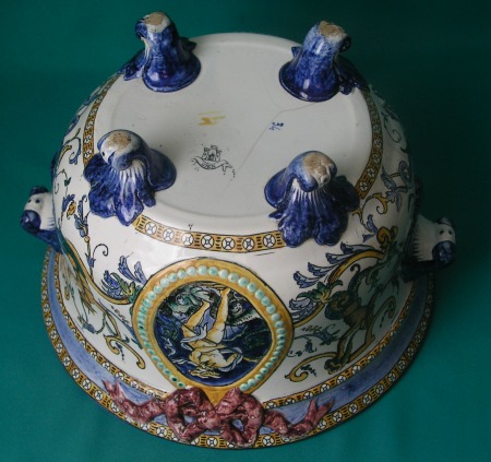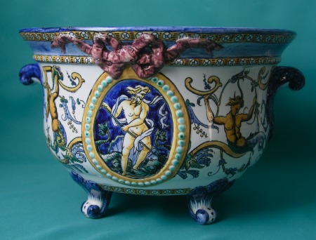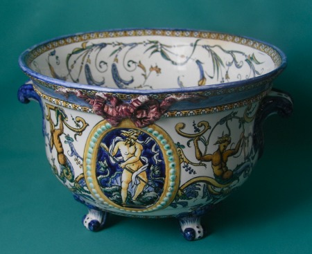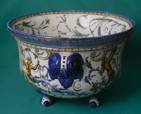 A Gien faience jardiniere, decorated in renaissance revival maiolica style with scrolling foliage and mythological creatures, raised on four scroll feet, second half of 19th century. Dimensions: 17.5 cm high x 26.5 cm diam. Condition: A hairline crack on the base. Marks: Black printed three towers mark, painted 34, 14, impressed device.