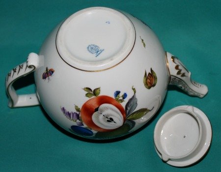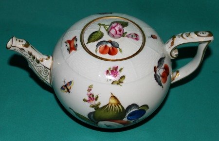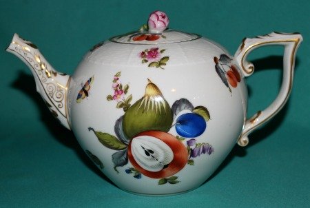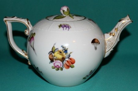 A Herend Porcelain Teapot, modelled in Meissen style, the cover with flower knob, finely painted in Market Garden" pattern with fruit, insects, flowers, butterflies and mushrooms. Dimensions: 23 cm from handle to spout, 15 cm high. Printed marks in blue on the base. Excellent condition.