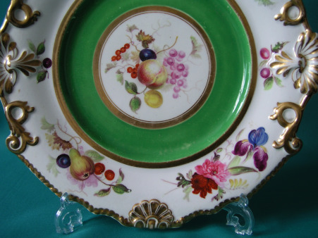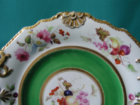 A Machin Porcelain Dessert Plate, moulded drop shell edge, finely painted with flowers and fruit on an apple green ground highlighted in gilt c.1825. Dimensions: D.9". Marks: pattern 762 painted in red. Condition: Minor ware and crazing.
