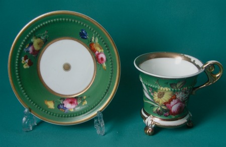 A fine Minton cabinet (caudle) porcelain cup and stand, c. 1825-30 of Empire form, the flared cup supported by three claw feet and applied with an elaborate handle, painted in colours with a bouquet of flowers on emerald green ground, the stand with three floral sprays, gold borders and bands of "jewels". Dimensions: 8.4 cm high x 8.3 cm diam.; stand 13.7 cm diam. Condition: stand excellent, the cup with minor damage near the rim, some ware on the gilding. Unmarked.