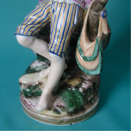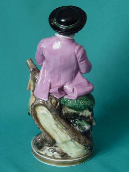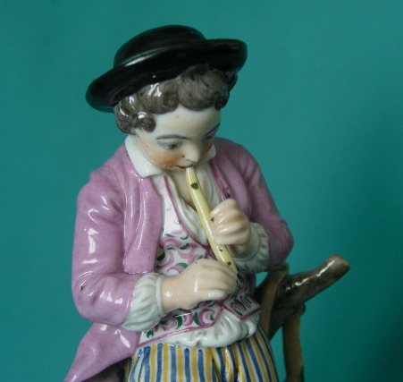 A Niderviller Porcelain Figure, modelled as a shepherd boy,sitting on a log and playing his pipe, finely painted with coloured enamels, on circular base c.1800. Dimensions: 19 cm. high. Condition: Minor damage. Unmarked.