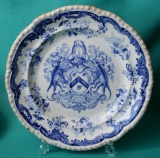 A Minton Pearlware Armorial Dinner Plate, c.1820, transfer-printed in blue underglaze, the border from "Chinese Marine" pattern and the center with the Arms of the Worshipful Company of Ironmongers, one of the Livery Companies of London, incorporated under Royal Charter in 1463. Marks: blue star on the base. Condition: several small chips and some staining on the back.