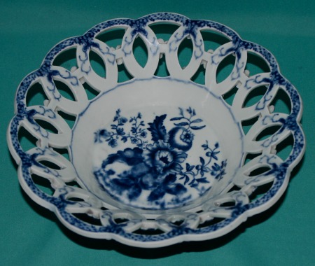 A Worcester porcelain circular* basket c.1770-5, pierced rim with applied flower heads to the reverse, printed in blue underglaze with "Pine Cone" design and hand-painted border. Dimensions: 23 cm diam. Marks: printed crescent mark on the base. Excellent condition.